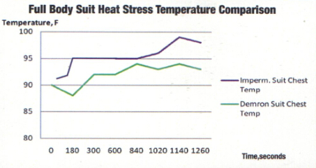 實驗條件:工作人員身穿不同防護服,以3.5英里/小時的速度在跑步機上慢跑3分鐘后測量全身防護服的溫度,再隨時間推移不斷測量防護服內的溫度變化。藍色曲線代表通用防護服,綠色曲線代表使用Demron材料制成的防護服。