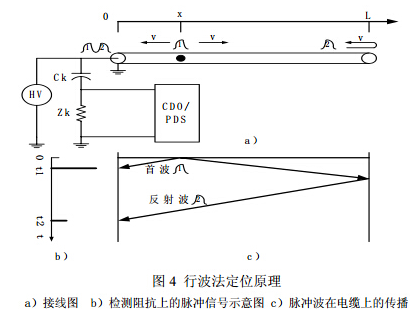 對于電力電纜局部放電的定位,早期*有對電纜實行掃描式檢測查找局部放電點的技術,現在實際中采用的是70年代發展起來利用局部放電脈沖在電纜上的傳播特性,用10MHz以上的高頻掃描示波器進行定位測量的方法,該法也叫行波法或TDR法,其原理如圖4所示。